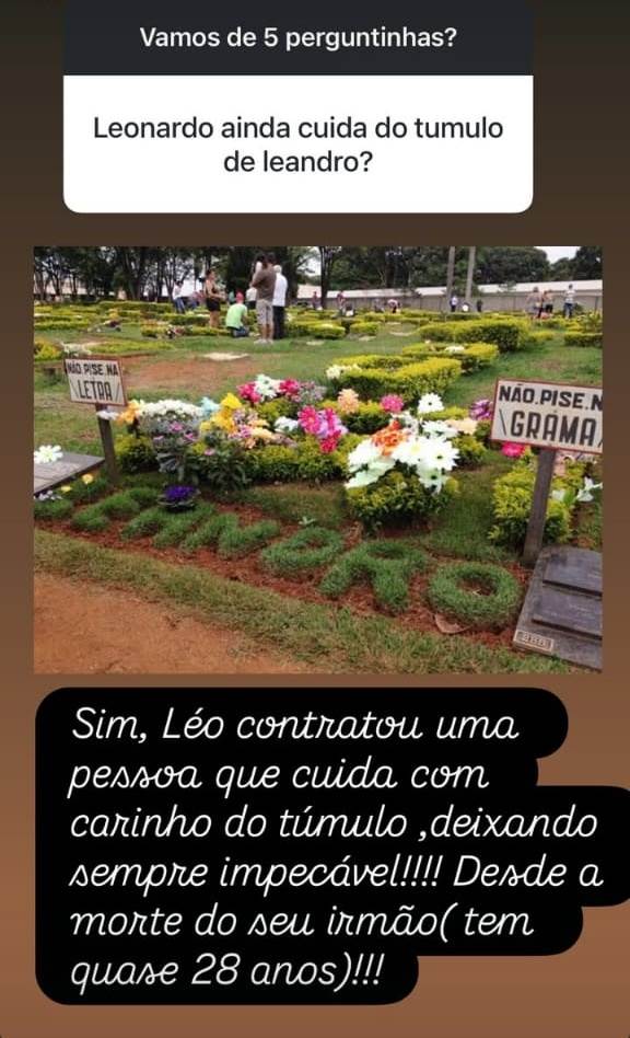 A influenciadora digital compartilhou uma foto do local e respondeu: "Sim, Léo contratou uma pessoa que cuida com carinho do túmulo, deixando sempre impecável! Desde a morte do seu irmão (tem quase 28 anos)", escreveu ela.