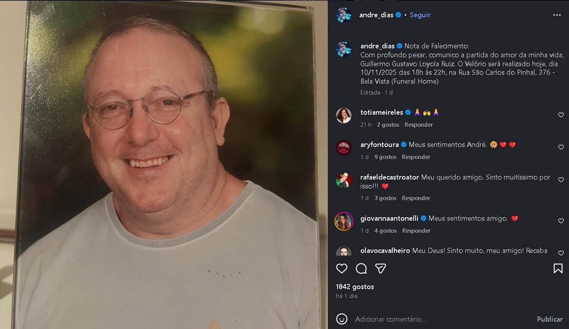 O ator André Dias usou as redes sociais nesta segunda-feira, 10, para compartilhar uma triste notícia com os seus seguidores. Na publicação, ele lamentou a morte do marido, o escritor Guillermo Gustavo Loyola Ruiz.