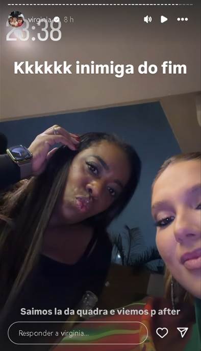 Durante a noite, Virginia publicou registros ao lado de Fernanda nas redes sociais e mostrou que as duas seguiram juntas na comemoração após o ensaio. "Inimiga do fim. Saímos lá da quadra e viemos para o after", disse.