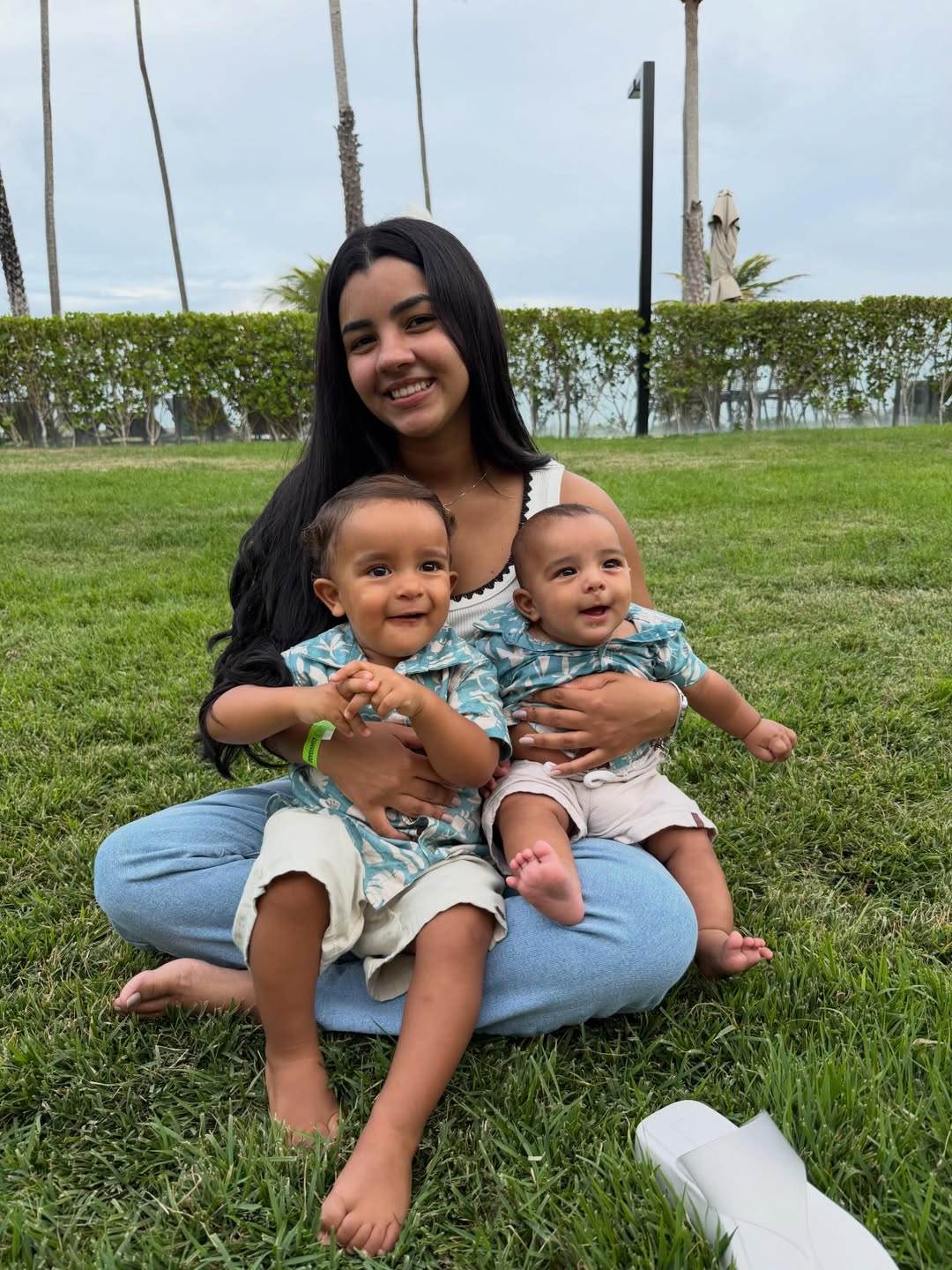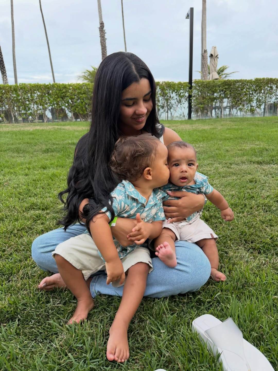 Nas imagens, a influenciadora surge sentada na grama, sorridente, com Jorge, de dois anos, e Joaquim, de quatro meses, no colo.