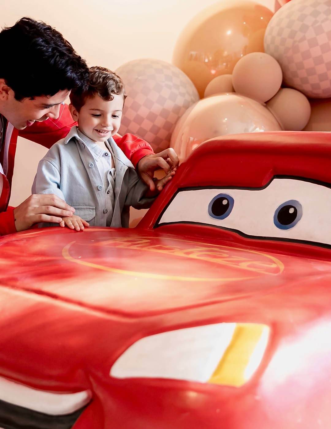 O pequeno ficou admirado ao ver a decoração da animação Carros, os personagens, brincadeiras e atrações como animais.