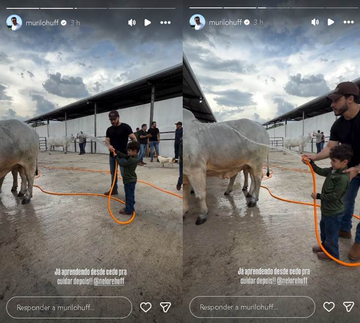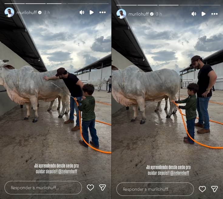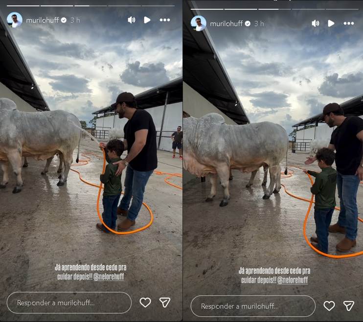 O cantor Murilo Huff fez uma rara aparição com seu filho, Léo, de 5 anos, fruto do relacionamento com a cantora Marília Mendonça (1995-2021). Na publicação, o menino esbanjou fofura ao ajudar o pai a cuidar de uma vaca da empresa da qual o artista é sócio.