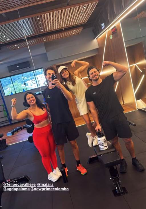 O romance entre Maiara, de 38 anos, dupla de Maraisa, e Felipe Cavalliere, de 24, segue ganhando força. Nesta terça-feira (7), o personal trainer do casal de sertanejos publicou um registro do treino feito com eles, e o Felipe republicou o conteúdo, agitando a web - na imagem, Maiara aproveitou para "biscoitar" e exibir os músculos ao lado de Felipe.