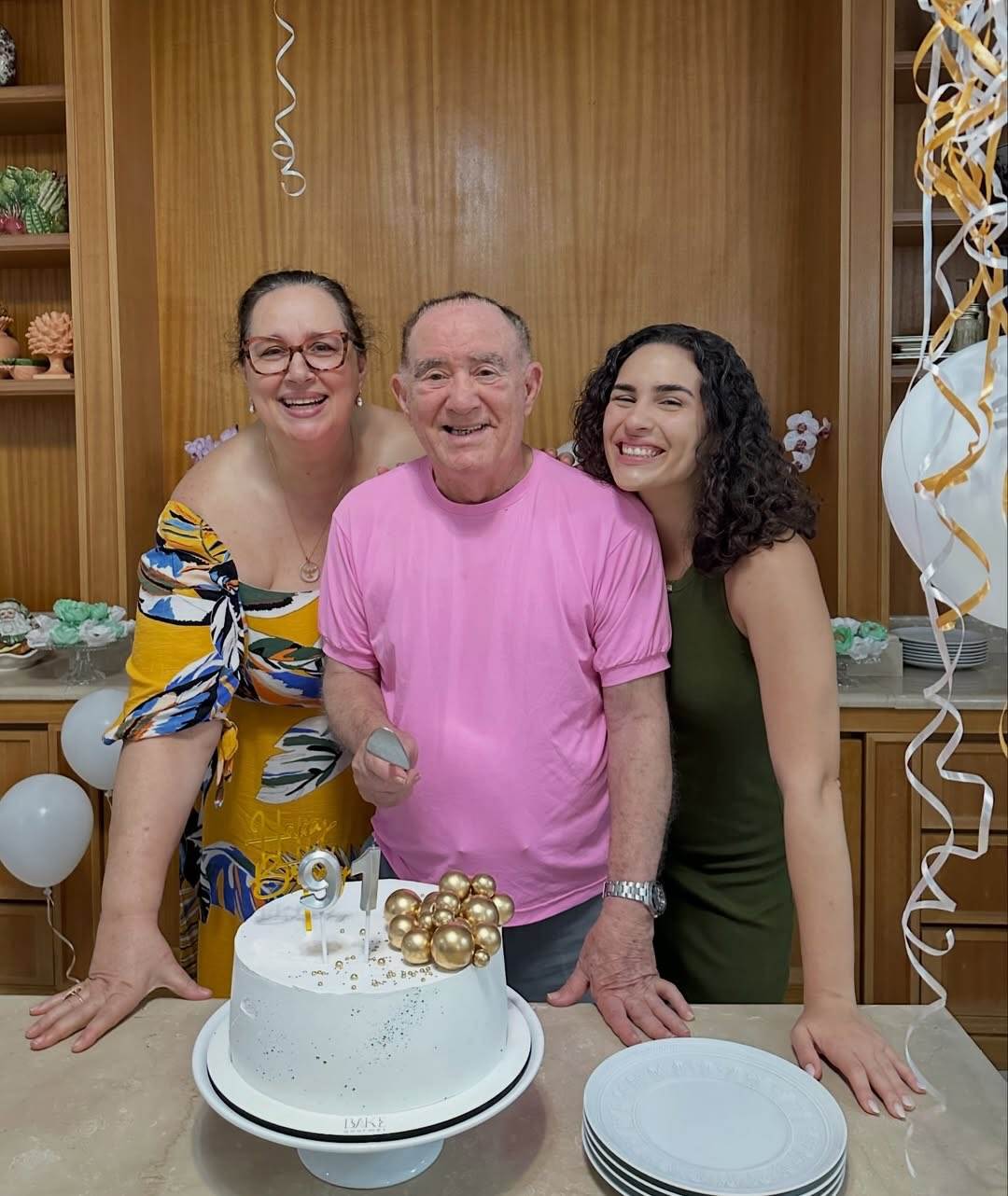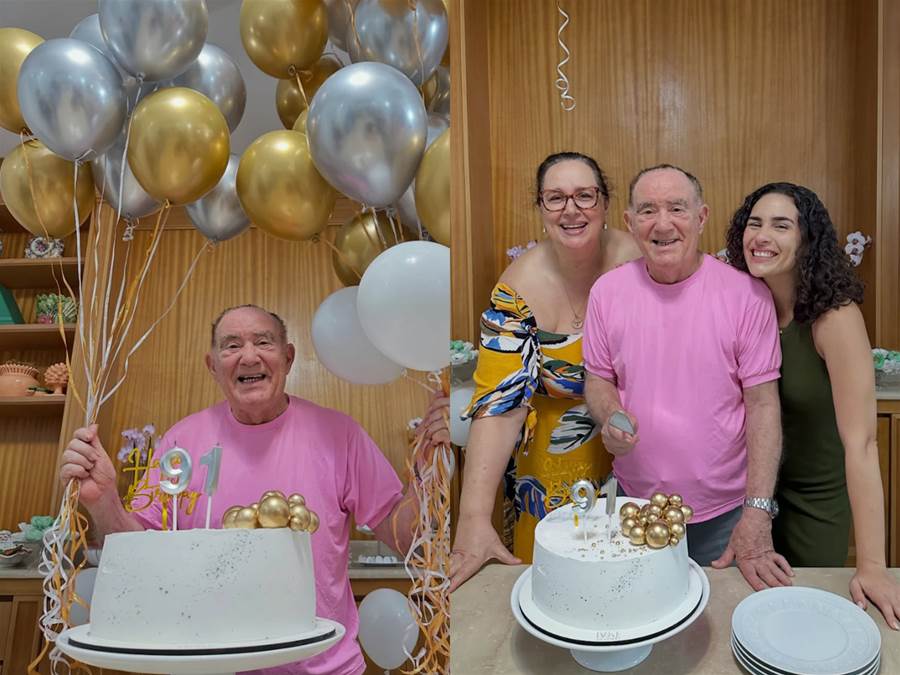 A festa de aniversário de Renato Aragão contou com uma decoração temática composta por balões e um bolo personalizado. O artista apareceu sorridente nas imagens ao lado de sua esposa, Lilian Aragão, com quem é casado desde 1991.