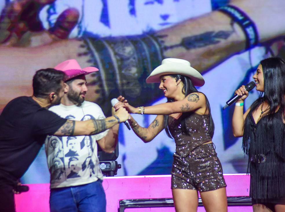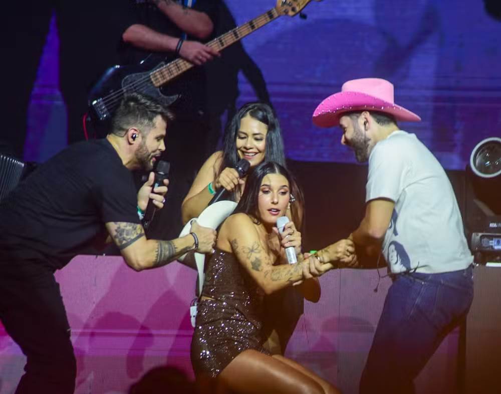 Ana Castela, de 21 anos, acompanhada de Zé Felipe, de 27 anos, em show na Suhai Music Hall, em São Paulo, na noite do último sábado (11), foi acidentalmente derrubada no palco durante apresentação. A Boiadeira convidou o influenciador Odorico Reis ao palco, e, após ter se despedido, a cantora chamou ele novamente ao espaço.