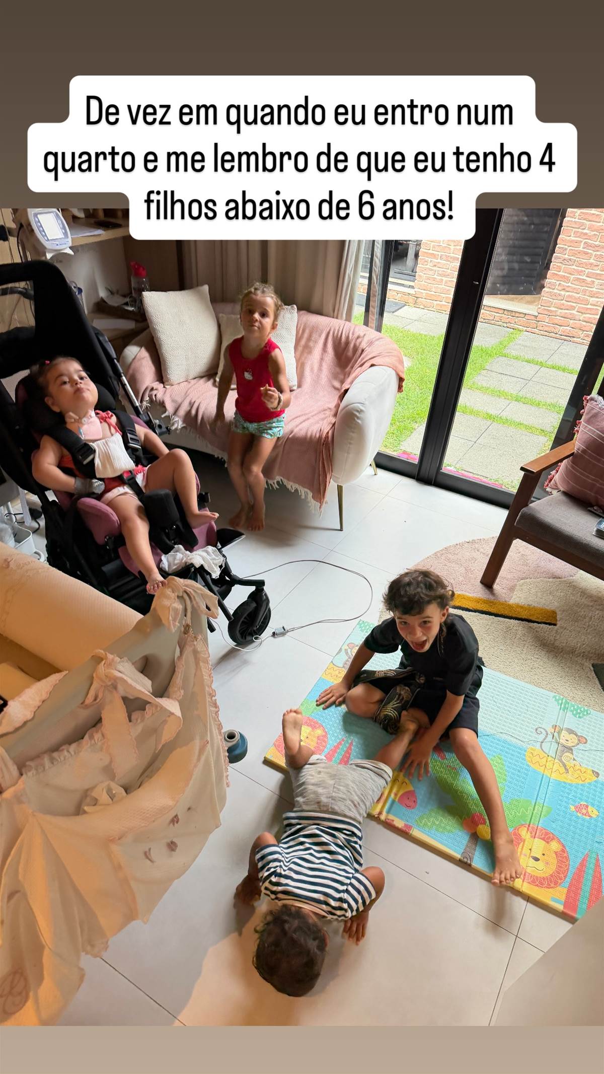 "De vez em quando eu entro num quarto e me lembro de que eu tenho 4 filhos abaixo de 6 anos!", brincou ela na legenda.