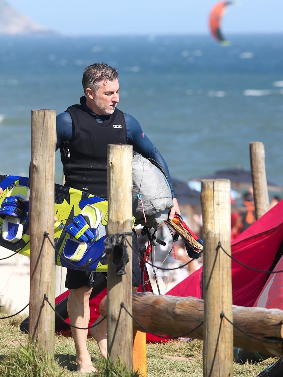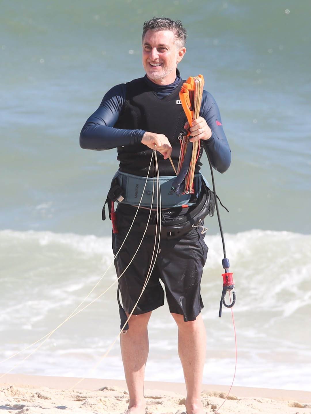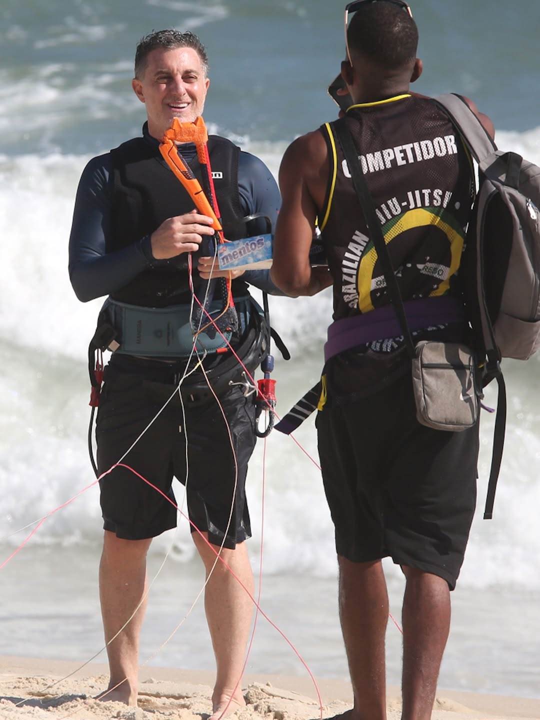 Luciano Huck, de 54 anos, enfrentou as ondas do mar da Barra da Tijuca, no Rio de Janeiro, nesta segunda-feira (22). O apresentador do Domingão com Huck aproveitou a folga para cair no gelado mar carioca - devidamente protegido com um colete de neoprene. O marido de Angélica é adepto do kitesurf, esporte em que a pessoa surfa em uma prancha, com ou sem alças para os pés, e "voa" impulsionada por uma pipa (kite, em inglês).