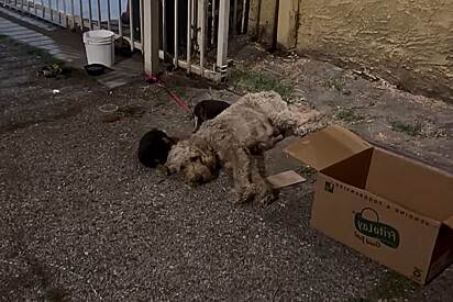 Ao chegar ao beco escuro, Arturo encontrou uma triste cena: uma cadela poodle estava amarrada a um corrimão, visivelmente fragilizada e presa com uma corda sufocante ao redor do pescoço. A poucos centímetros dela, uma caixa de papelão antiga servia de abrigo para dois filhotes desorientados que buscavam desesperadamente pelo calor da mãe. Flores notou o perigo imediato para todos — o aperto da corda não só ameaçava a vida da mãe, mas também indicava o descaso cruel que havia levado a pequena família até ali.