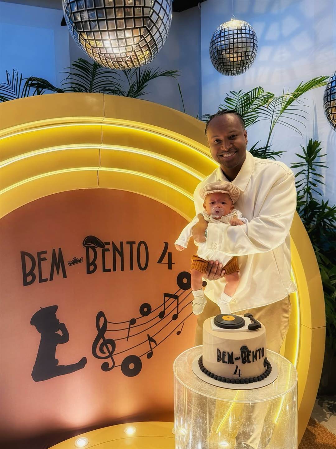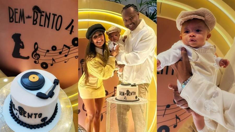 Carol Peixinho, de 40 anos, e Thiaguinho, de 42, celebraram o quarto mês de vida do filho, Bento, com uma festa com a temática musical, nesta segunda-feira (19). O pequeno posou no colo do pai, todo estiloso, com uma boina. A ex-BBB também caprichou no visual para as fotos. Ela elegeu um look inspirado na década de 1970, quando o ritmo Black Music teve seu ápice.