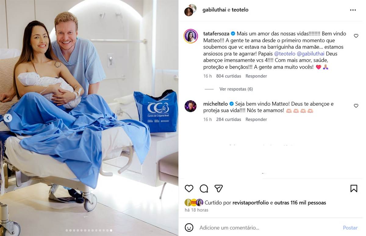 Nos comentários da postagem de Gabi Luthai, Thais e Michel deixaram mensagens carinhosas: "Mais um amor das nossas vidas! Bem-vindo Matteo! A gente te ama desde o primeiro momento que soubemos que você estava na barriguinha da mamãe…", escreveu a atriz e apresentadora.