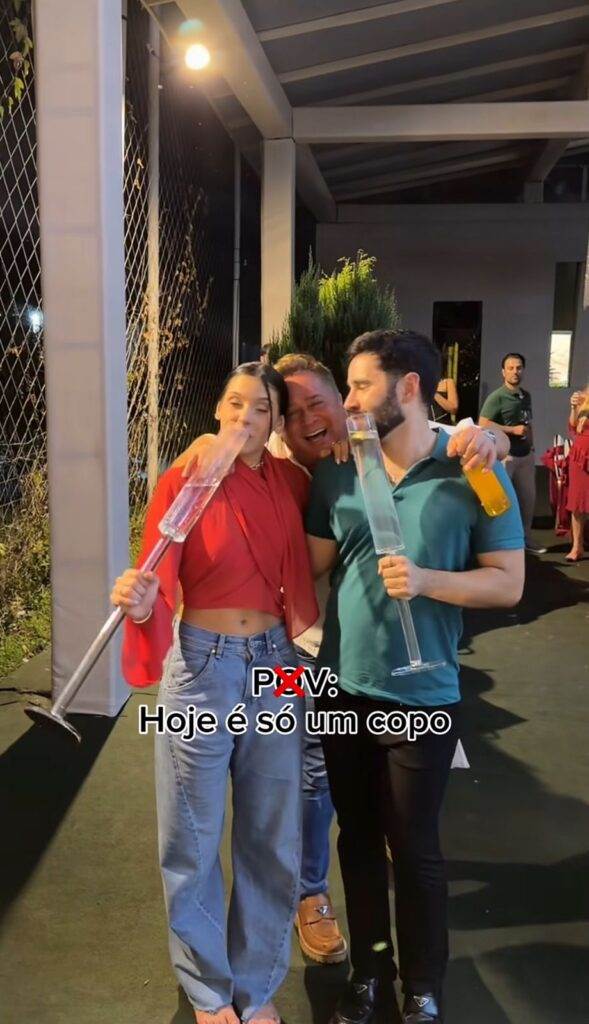No vídeo compartilhado no Instagram oficial da Boiadeira, Ana apareceu posando ao lado do amigo, o influenciador digital Odorico Reis, com taças gigantes, cheias até a boca. Em clima de descontração, Leonardo surgiu de surpresa, abraçou os dois e, claro, caiu na risada ao perceber o tamanho nada comum dos copos.