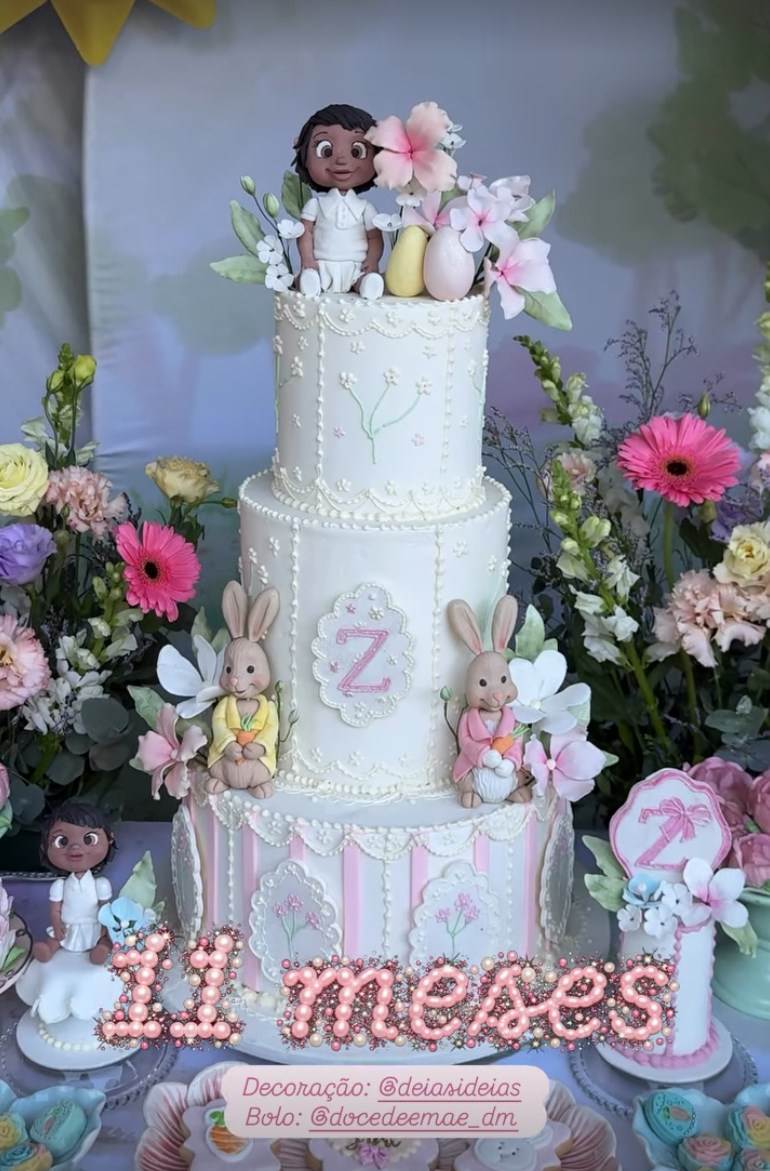 Zuri também ganhou um bolo especial para comemorar o seu mesversário. O doce de três andares em tons suaves contou com detalhes delicados em relevo e flores decorativas. No topo, uma bonequinha sentada entre flores, enquanto coelhinhos enfeitam as camadas inferiores.