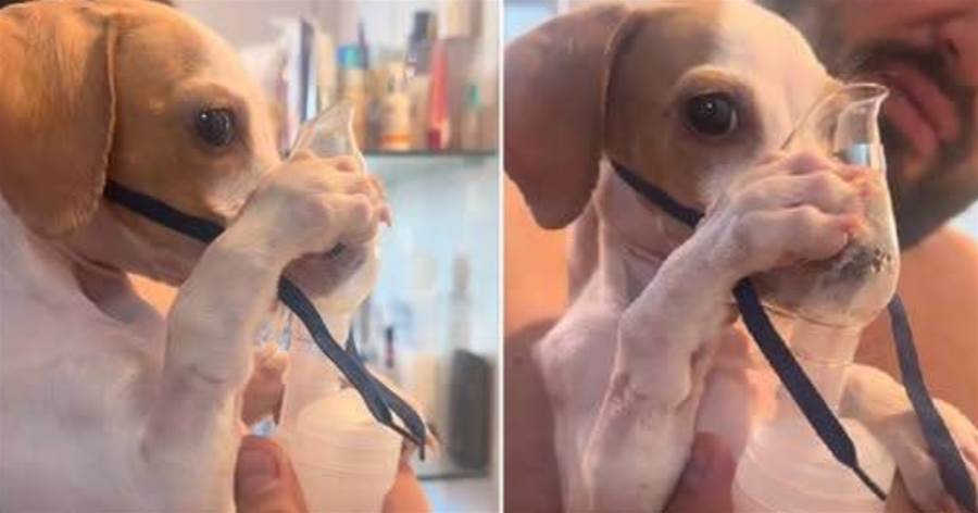 Com suas próprias patinhas, ele segura a máscara, como se entendesse que aquilo o ajudava a respirar melhor.