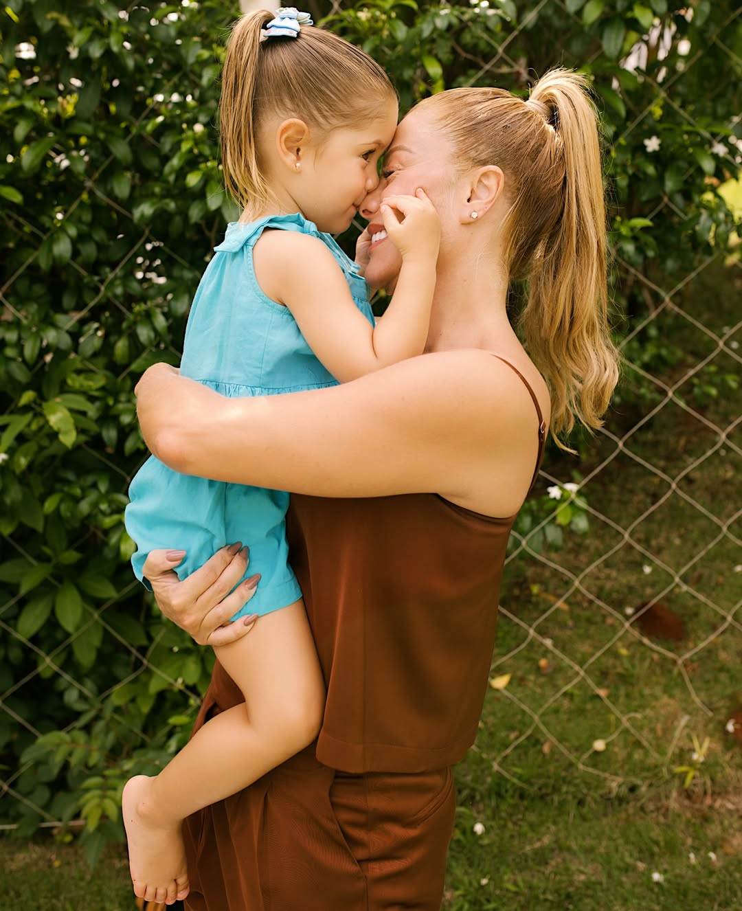 Nos cliques, Poliana apareceu sentada, em toalhas estendidas na grama, ao lado das crianças.