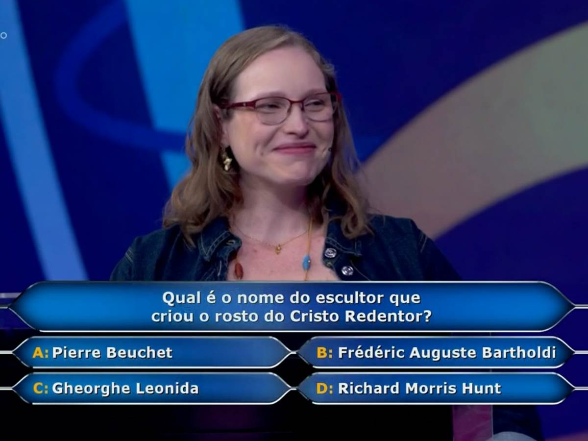 Ao chegar na última pergunta do game, Luciano Huck perguntou: "Qual é o nome do escultor que criou o rosto do Cristo Redentor?". Carolina precisava escolher entre as alternativas: a) Pierre Beuchet; b) Frédéric Auguste Bartholdi; c) Gheorghe Leonida; e d) Richard Morris Hunt.