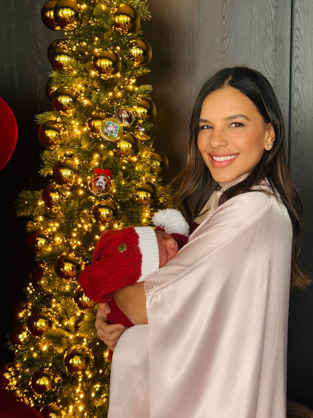 Na rede social, ela encantou ao surgir com o bebê no colo ao lado da árvore, que teve uma decoração em homenagem ao recém-nascido.