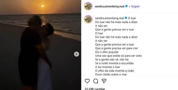 A publicação foi acompanhada por um trecho da canção 'A Gente Precisa Ver o Luar', do compositor Gilberto Gil. A jornalista aproveitou a legenda para agradecer publicamente ao músico por embalar o momento romântico do casal.