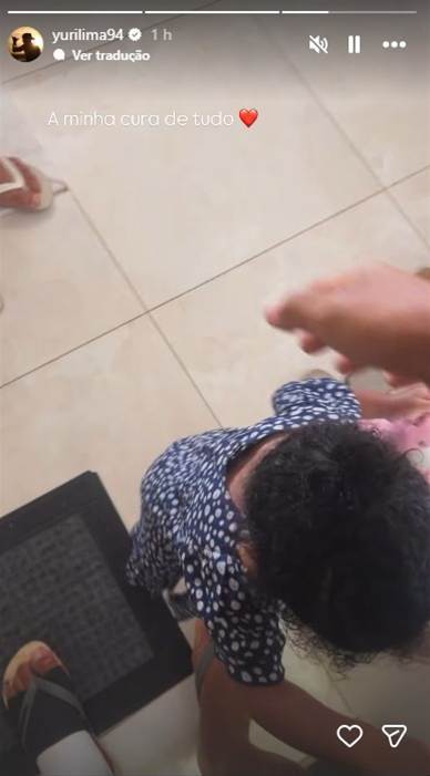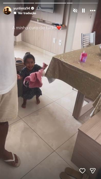 "A minha cura de tudo" escreveu Yuri no Story do Instagram. Ao abrir a porta, Nala começou a saltitar de alegria com um vestido escuro de bolinhas, sorrindo para o pai. Depois ela empurrou a perna do jogador para o lado para passar pela porta.