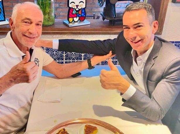 Na legenda da foto, Tralli não hesitou em compartilhar um momentos descontraído durante o almoço com o pai: "Papai e eu. 82 e 54. César e César Jr. Uma saborosa resenha a dois no almoço. Na saída, a descontração: -Adorei te ver pai. Você está ótimo! -Só acho que eu comi demais.