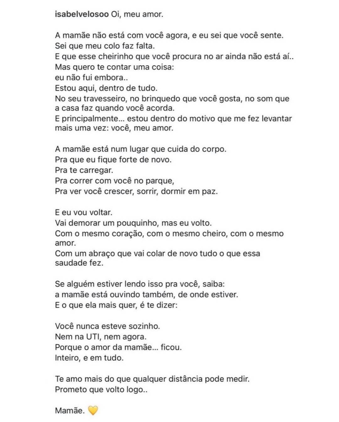 A influenciadora também revelou que a principal motivação para lutar contra a doença era justamente o filho. Isabel falou sobre seu desejo de se recuperar para poder brincar com ele, levá-lo ao parque e acompanhá-lo enquanto crescia, dormia e sorria.