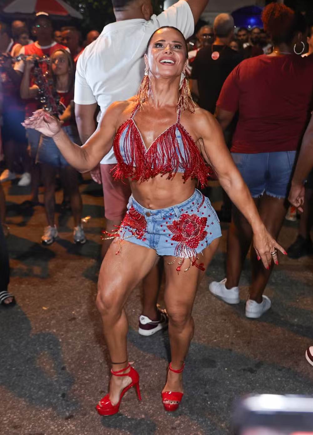A atriz esbanjou samba no pé e carisma ao som do samba enredo que homenageia a carnavalesca Rosa Magalhães. Para a noitada de samba, ela recebeu o marido, o empresário Guilherme Militão, com quem trocou beijos, e apostou em um look de top vermelho com franjas e um shortinho jeans, que trazia detalhes da mesma cor da escola.
