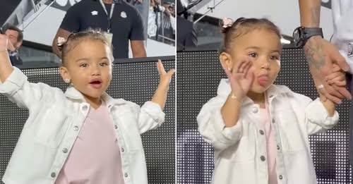 Mas não foi apenas o look que capturou a atenção dos presentes. Mavie mostrou que está levando jeito para seguir os passos do pai, pelo menos no quesito carisma. Antes da partida, ela se aventurou na lateral do campo ao lado de Neymar, protagonizando um show pessoal de caretas.