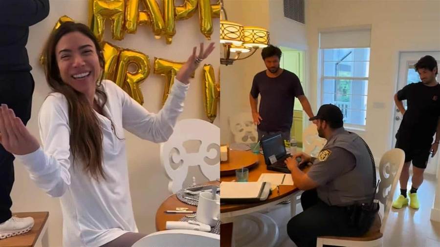 Bem-humorada, a aniversariante, de 48 anos, apareceu dando risada enquanto atendia a autoridade com seu marido, o político Fábio Faria. A irmã então comentou enquanto gravava o momento que estavam arrumando a festinha e relatando o furto de um carro para o policial.