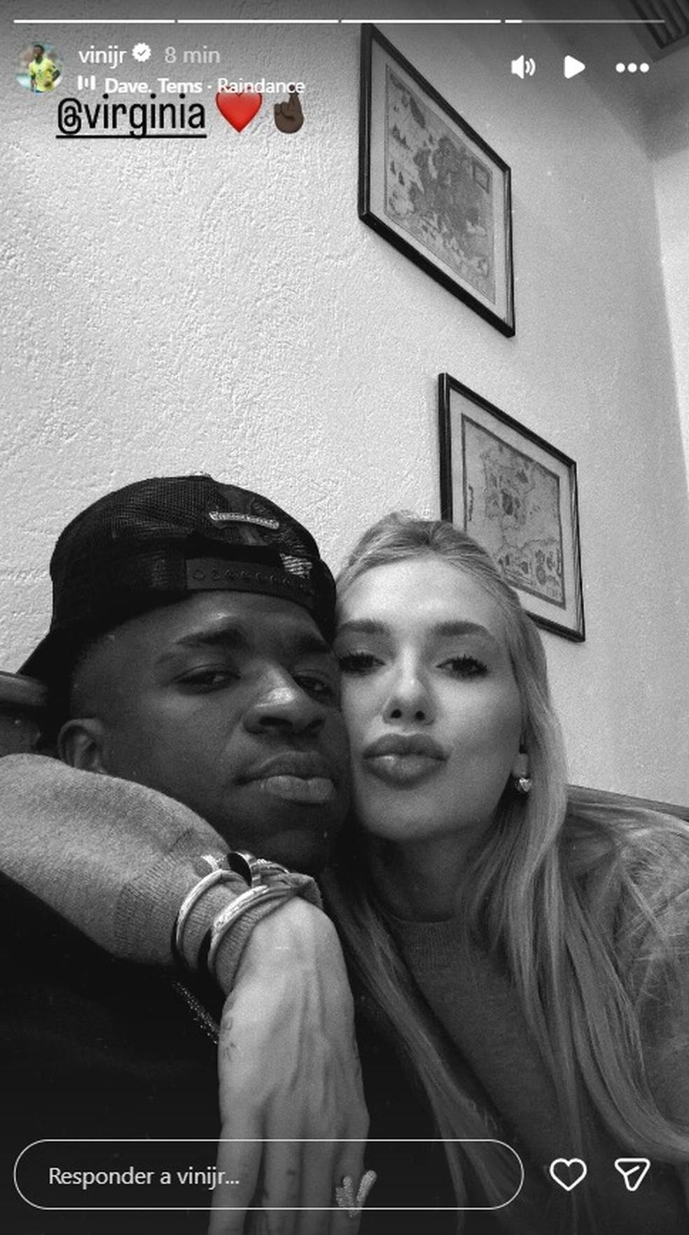 O homem está amando demais! Vini Jr, de 25 anos, postou um clique romântico ao lado de Virginia Fonseca, de 26, nesta quinta-feira (12), no Instagram. Na legenda da foto, o jogador do Real Madrid colocou dois emojis: um coração vermelho e um de dedos cruzados. Para completar, ele ainda apostou em uma música que fala sobre etapas do relacionamento.