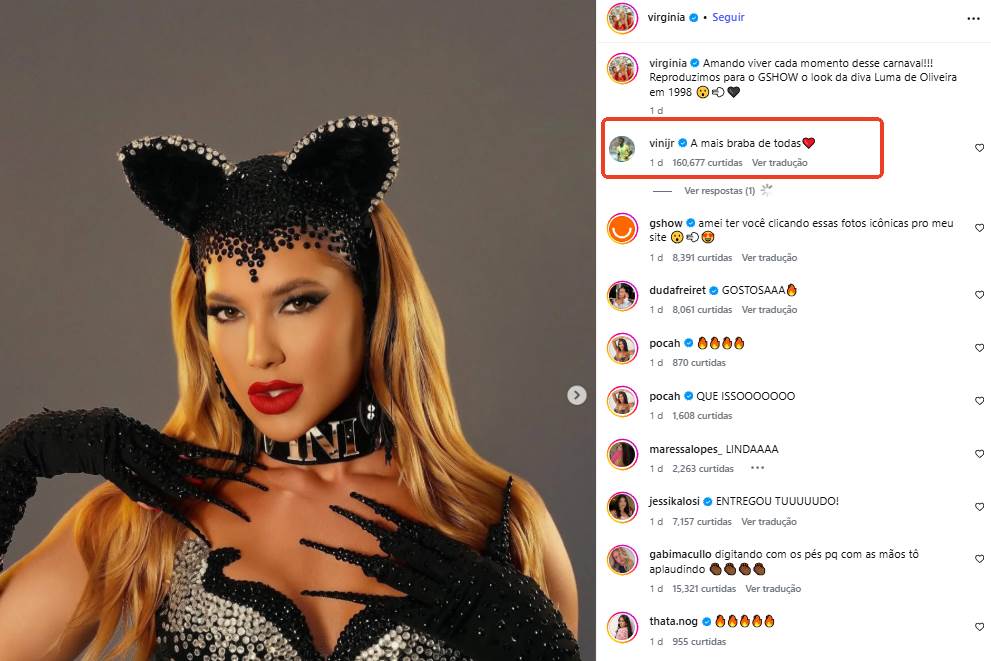 Seguindo a mesma proposta, a empresária optou por personalizar a coleira com o nome do companheiro, Vini Jr. "Amando viver cada momento desse carnaval!!! Reproduzimos para o GSHOW o look da diva Luma de Oliveira em 1998", escreveu ela na legenda.