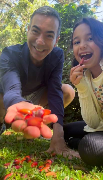 O âncora do Jornal Nacional está em Campos do Jordão e aproveitou para reviver com a herdeira uma tradição de quando era criança: pegar pinhão. "E aí, pessoal, tudo bem? Estou aqui com a Manu em Campos do Jordão, fazendo algo que eu fazia quando eu era criança, eu tinha a idade dela, pegando pinhão.