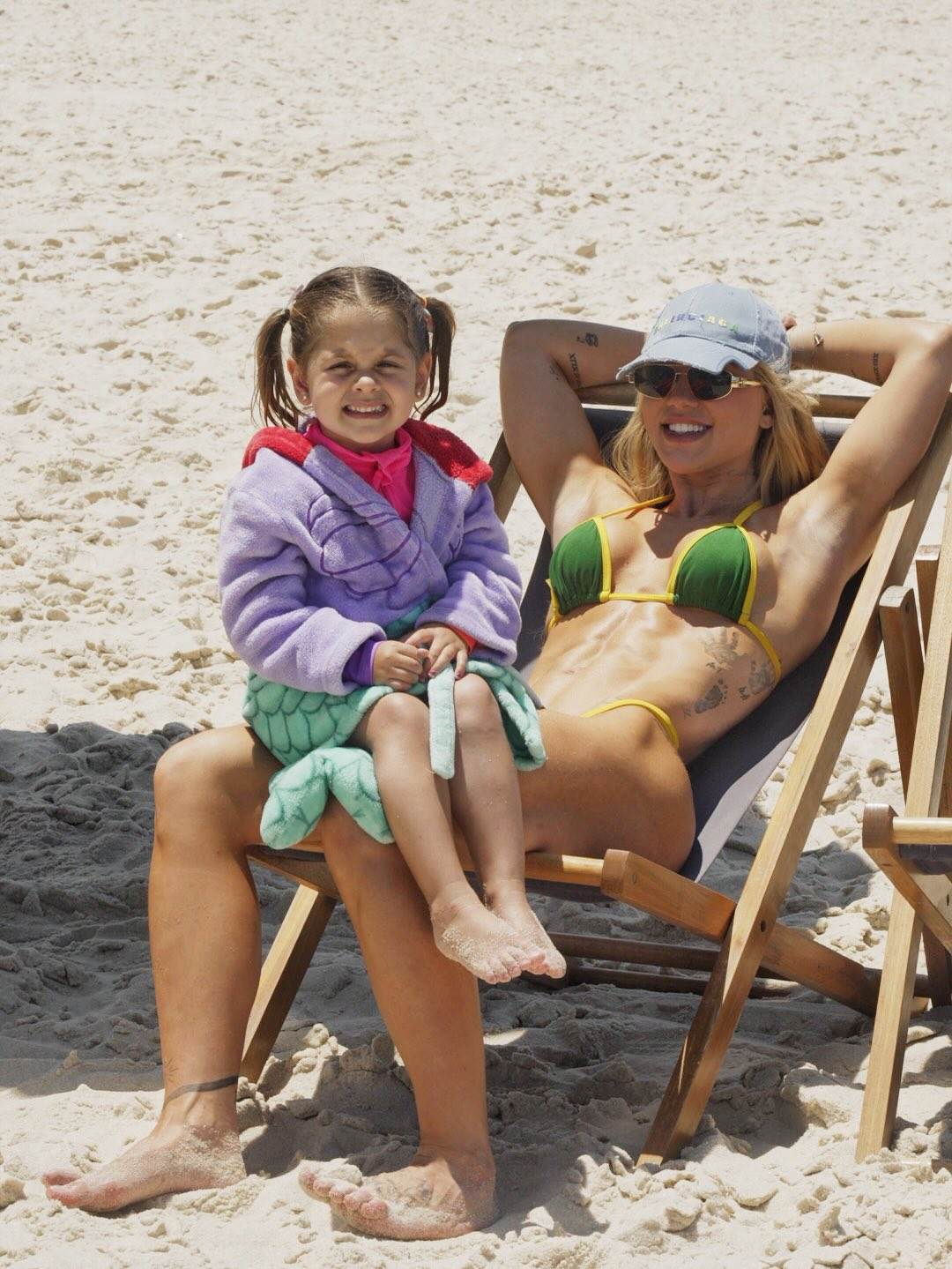 Para o momento de lazer, Virginia optou por um biquíni verde e amarelo, e chamou a atenção ao ostentar seu corpo escultural enquanto renovava o bronzeado na areia e também se refrescava no mar.