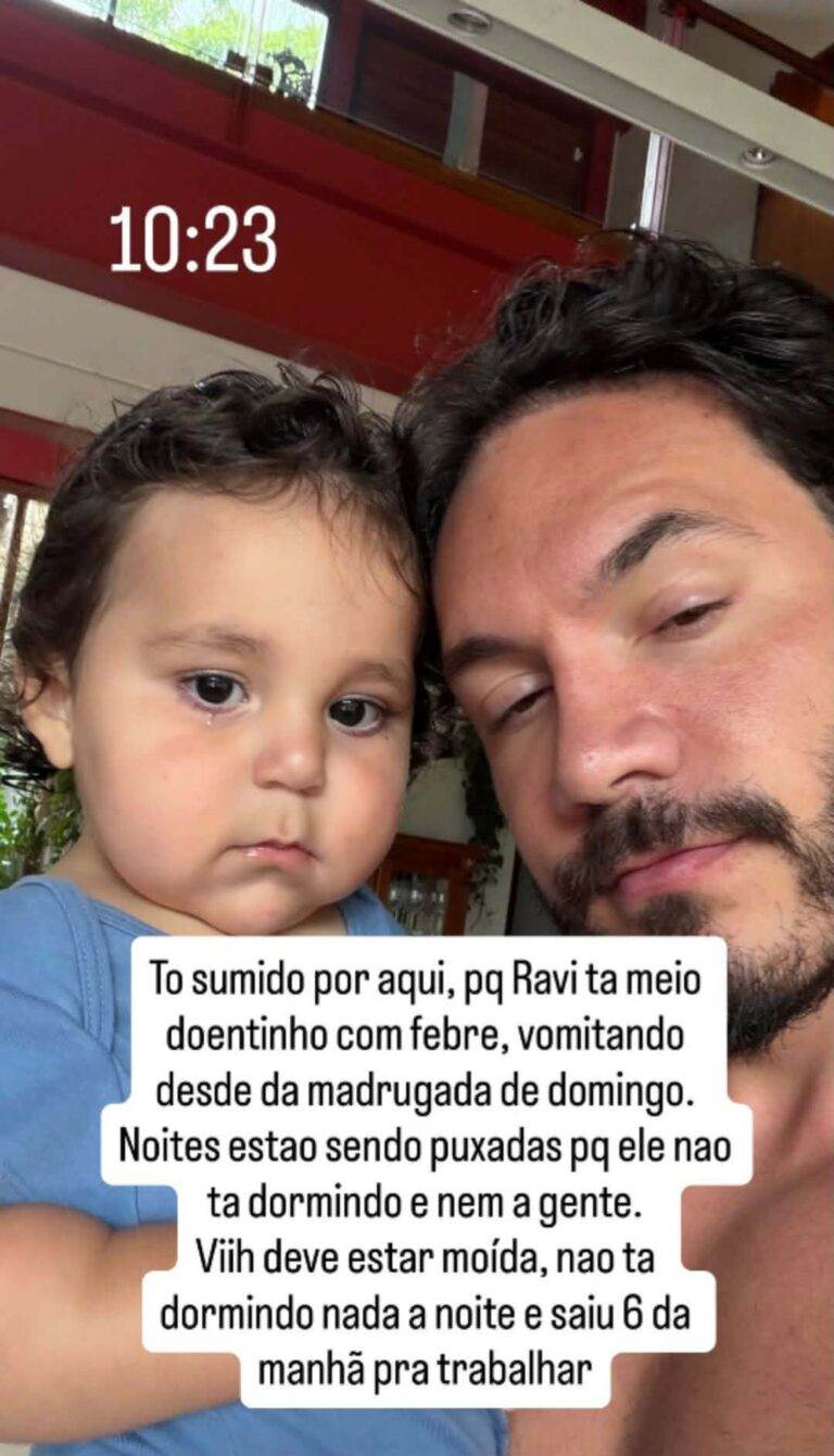 "Estou sumido por aqui porque o Ravi tá meio doentinho com febre, vomitando desde a magrugada de domingo. Noites estão sendo puxadas porque ele não está dormindo e nem a gente", explicou.