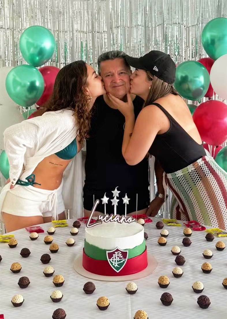 Mel Maia, de 21 anos de idade, reapareceu na web, neste domingo (21), pouco mais de três semanas depois da morte repentina da mãe, Debora Maia. A atriz celebrou mais um ano de vida do pai, Luciano Souza. No registro, ela aparece dando um beijo sanduíche no patriarca, com bolo e decoração do time do coração dele, o Fluminense.