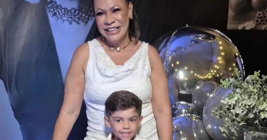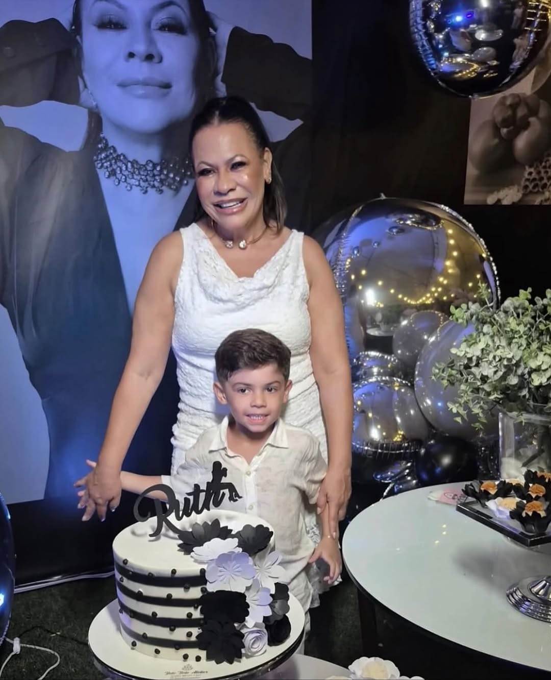 Nas redes sociais, Dona Ruth compartilhou um registro ao lado do neto, que vestia uma camisa clara, combinando com o vestido branco da aniversariante. Sorridentes, os dois posaram diante de um bolo de dois andares decorado com listras, flores neutras e toques metálicos, levando o nome “Ruth” no topo. Um grande painel com a imagem de Dona Ruth e balões prateados completavam o cenário elegante.