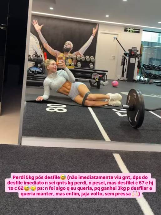 "Perdi 5 kg após o desfile (não imediatamente viu, gente, depois do desfile imediato não sei quantos quilos perdi, não pesei, mas desfilei com 67 kg e hoje estou com 62 kg). P.S.: Não foi algo que eu queria, porque ganhei 3 kg para desfilar, queria manter, mas enfim, já já volto, sem pressa", declarou Virginia nos Stories do Instagram.