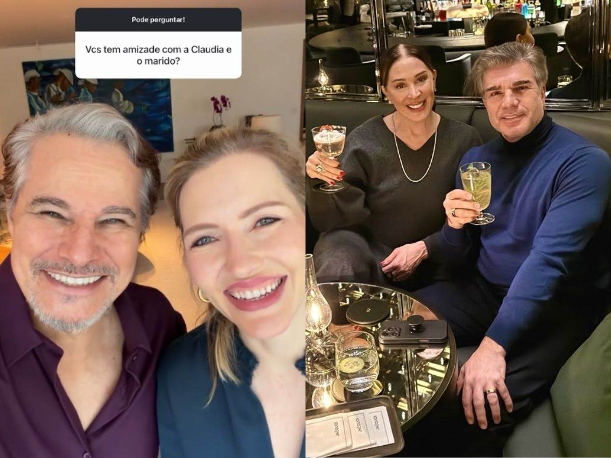 "Nós temos uma ótima relação com Claudia, com Jarbas", afirmou o ator. Em seguida, Karin detalhou como esse convívio acontece na prática: "É uma relação de convívio distante. Eles moram em São Paulo e a gente mora no Rio.