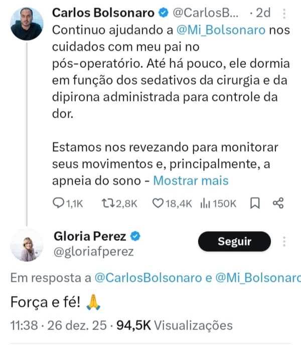 Em publicação feita no X, antigo Twitter, Carlos explicou que está ajudando a ex-primeira-dama Michelle Bolsonaro nos cuidados do pai durante o pós-operatório. Ele detalhou que Jair Bolsonaro permanecia sob efeito de sedativos e medicamentos para controle da dor, além de relatar preocupação com episódios graves de apneia do sono, condição que, segundo ele, exige monitoramento constante para evitar complicações.