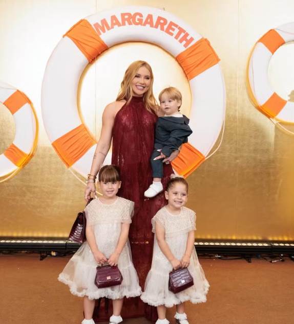 A aniversariante escolheu um conjunto branco de terninho e saia, com uma fenda generosa na perna, enquanto Virginia usou um vestido roxo rendado com transparências no busto. O tema da celebração foi Cruzeiro da Margareth, com decoração e brindes que remetiam a um ambiente de navio.