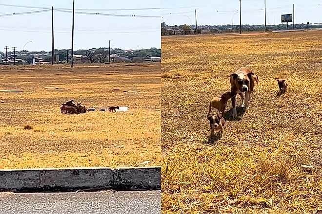 Lá estava uma pitbull, sozinha e vigilante no canteiro central, cercada por cinco filhotes desamparados, desesperados por segurança.