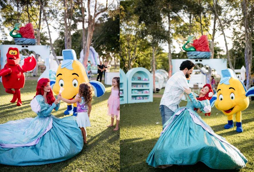 Zion e Angelina, de 1. A festa levou 30 dias para ficar pronta e, a pedidos da aniversariante, Biah surpreendeu ao aparecer vestida de Ariel, deixando sua filha ainda mais encantada.