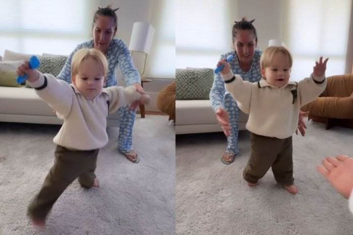 "REGISTRANDO AQUI OS PASSINHOS DO NOSSO PRÍNCIPE! Quero ver quando esse menino começar andar kkkkkkk se sem andar ele já causa obrigada Deus pelos meus filhos", escreveu a apresentadora do SBT ao mostrar o menino andando cambaleando.