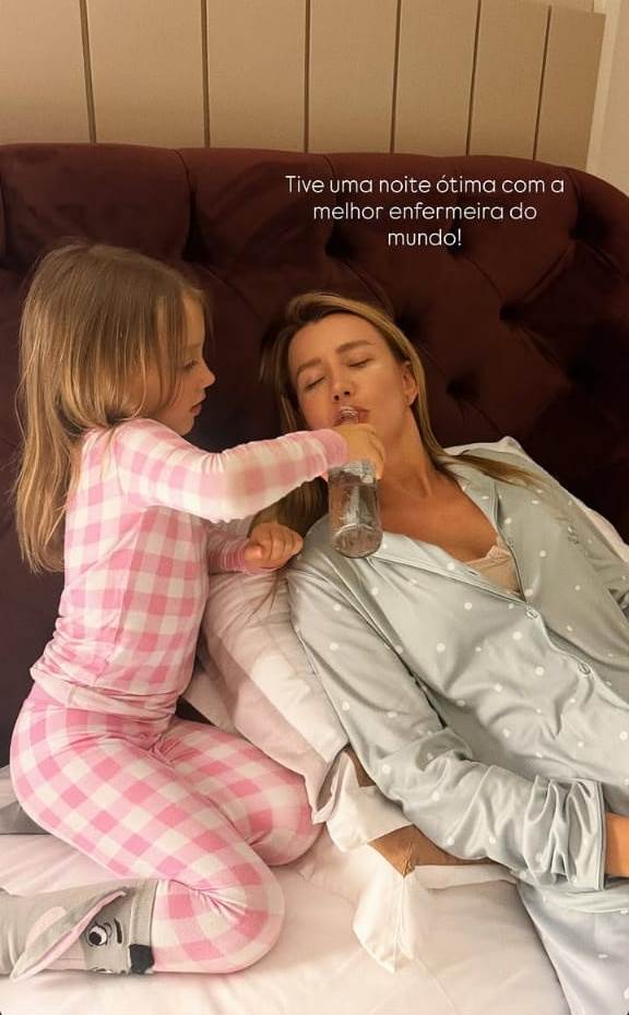 , de cinco anos. No primeiro registro, a pequena surge dando um beijinho no rosto da mamãe, depois, ela ajuda Ana Paula a tomar água. "Tive uma noite ótima com a melhor enfermeira do mundo!", contou a loira.