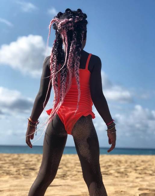 A garotinha está toda estilosa, usando um lindo maiô vermelho e dreadlocks cor-de-rosa nas madeixas.