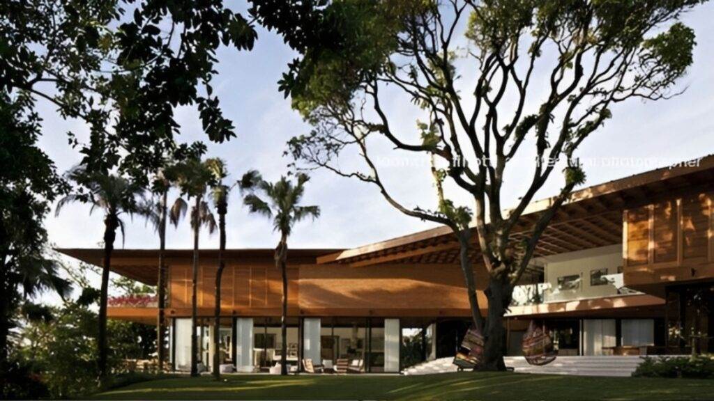 Com 1.500 m² de área construída, a residência conta com 16 quartos, sendo seis suítes, além de cinema, capela, piscina, salão de jogos, churrasqueira e um enorme jardim integrado à natureza. A arquitetura aposta em grandes janelas de vidro e pé-direito duplo, criando uma sensação de amplitude e conexão com a paisagem ao redor.